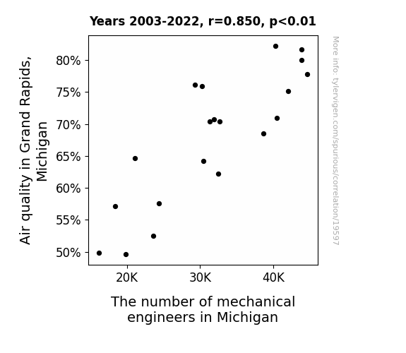This means 72.2% of the change in the one variable (i.e., The number of mechanical engineers in Michigan) is predictable based on the change in the other (i.e., Air quality in Grand Rapids, Michigan) over the 20 years from 2003 through 2022.