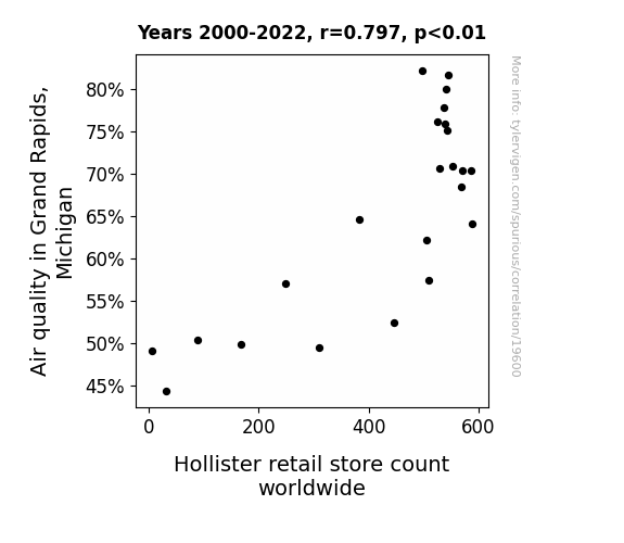 This means 63.6% of the change in the one variable (i.e., Hollister retail store count worldwide) is predictable based on the change in the other (i.e., Air quality in Grand Rapids, Michigan) over the 23 years from 2000 through 2022.
