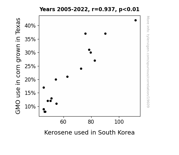 This means 87.9% of the change in the one variable (i.e., Kerosene used in South Korea) is predictable based on the change in the other (i.e., GMO use in corn grown in Texas) over the 18 years from 2005 through 2022.