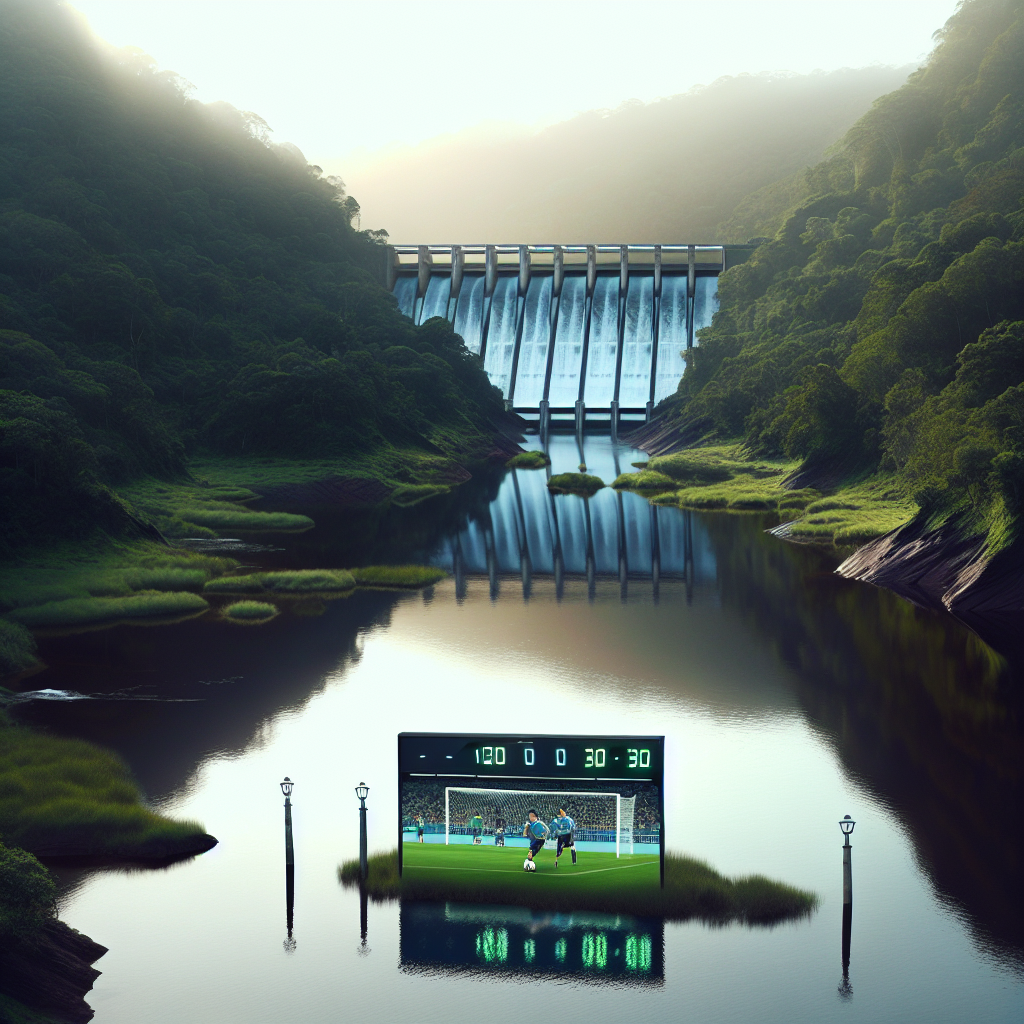 User prompt: Please respond with an image generation prompt that would be likely to create an interesting visual using DALLE-3, using the following style: [ Minimalism ] and depicting this scene: In Uruguay, a rushing river flows through green valleys, where a hydroelectric dam harnesses the powerful water to generate clean energy. On the riverbank, a scoreboard displays the total number of Gareth Bale's club football matches, with each goal scored representing a milestone in both energy production and the footballer's career. Keep the visual depiction simple. Do not include any words or speech bubbles.