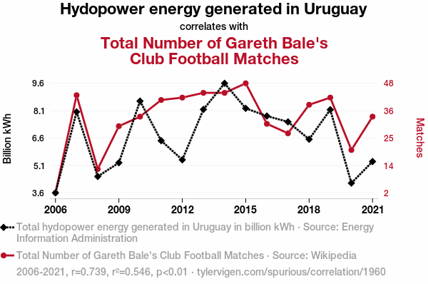 A linear line chart with years as the X-axis and two variables on the Y-axis. The first variable is Hydopower energy generated in Uruguay and the second variable is Total Number of Gareth Bale's Club Football Matches.  The chart goes from 2006 to 2021, and the two variables track closely in value over that time. Small Image