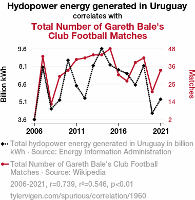 The allure of this research lies in its off-the-field discovery of a significant correlation coefficient of 0.7390653 and a p-value of less than 0.01 over the period from 2006 to 2021. This strong statistical connection between Uruguay's hydropower output and Gareth Bale's on-field appearances certainly raises eyebrows and prompts a good-natured chuckle. It appears that in the game of data analysis, there are indeed some unexpected "twists and Bale's."