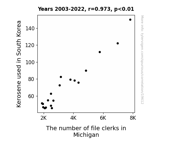 This means 94.7% of the change in the one variable (i.e., The number of file clerks in Michigan) is predictable based on the change in the other (i.e., Kerosene used in South Korea) over the 20 years from 2003 through 2022.