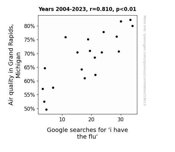 This means 65.6% of the change in the one variable (i.e., Google searches for 'i have the flu') is predictable based on the change in the other (i.e., Air quality in Grand Rapids, Michigan) over the 20 years from 2004 through 2023.