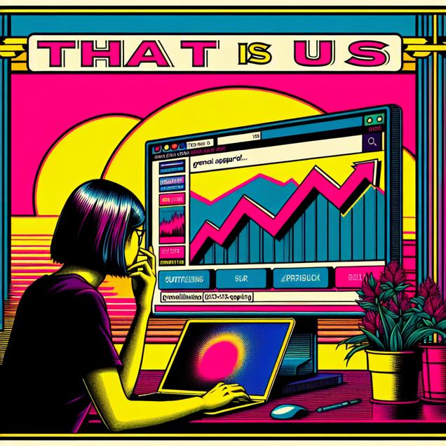 User prompt: Please respond with an image generation prompt that would be likely to create an interesting visual using DALLE-3, using the following style: [ Pop art ] and depicting this scene: In the scene, we see a person sitting at a desk with a laptop open, searching "that is sus" on Google. At the same time, a stock chart showing Lululemon's stock price is displayed on the screen, with the line graph showing a steady increase. Keep the visual depiction simple. Do not include any words or speech bubbles.
