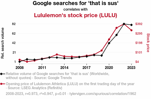 This means 94.7% of the change in the one variable (i.e., Lululemon's stock price (LULU)) is predictable based on the change in the other (i.e., Google searches for 'that is sus') over the 16 years from 2008 through 2023.
