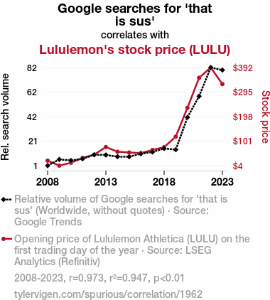 User prompt: Please provide potential search keywords for a paper titled Searching 'Sus' Signals: Sneaky Suspicions and Lululemon's Stock with an abstract of This study investigates the curious connection between Google searches for 'that is sus' and the stock price of Lululemon Athletica Inc. (LULU). Utilizing data from Google Trends and LSEG Analytics, our research team embarked on a whimsical quest to uncover any underlying link between online suspicions and athleisure profits. Our findings reveal a remarkably high correlation coefficient of 0.9732116 with a statistically significant p-value of less than 0.01 from 2008 to 2023. While some may dismiss this association as mere coincidence, our study sheds light on the potential impact of sly searches on seemingly unrelated financial fluctuations. Join us in navigating through the intriguing realm of digital musings and market movements, where the suspicious and the stock prices collide in a most unexpected fashion.