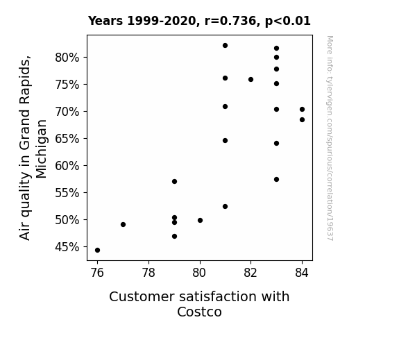 This means 54.2% of the change in the one variable (i.e., Customer satisfaction with Costco) is predictable based on the change in the other (i.e., Air quality in Grand Rapids, Michigan) over the 22 years from 1999 through 2020.