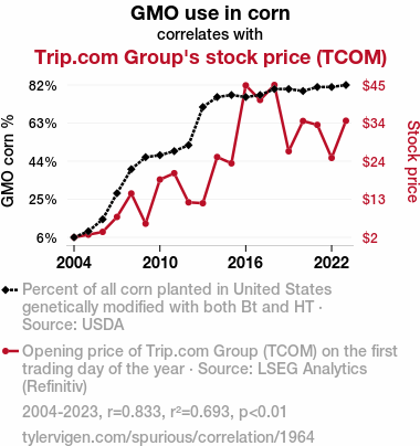 This means 69.3% of the change in the one variable (i.e., Trip.com Group's stock price (TCOM)) is predictable based on the change in the other (i.e., GMO use in corn) over the 20 years from 2004 through 2023.