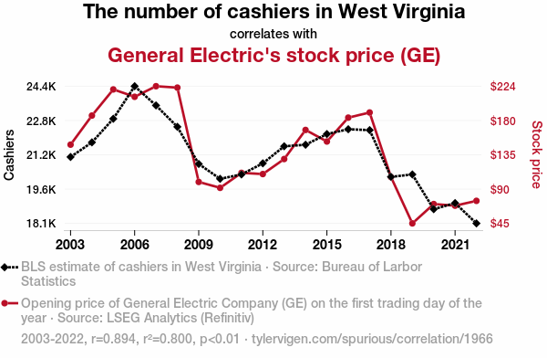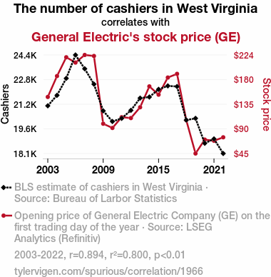 This means 80% of the change in the one variable (i.e., General Electric's stock price (GE)) is predictable based on the change in the other (i.e., The number of cashiers in West Virginia) over the 20 years from 2003 through 2022.