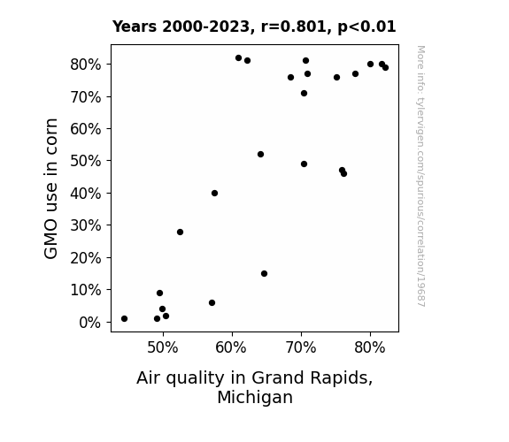 This means 64.1% of the change in the one variable (i.e., Air quality in Grand Rapids, Michigan) is predictable based on the change in the other (i.e., GMO use in corn) over the 24 years from 2000 through 2023.