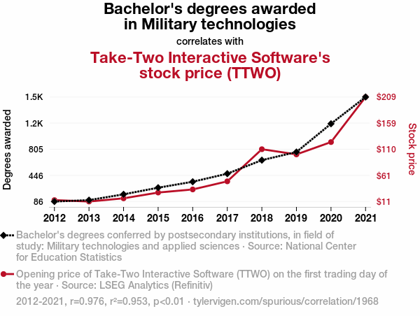 This means 95.3% of the change in the one variable (i.e., Take-Two Interactive Software's stock price (TTWO)) is predictable based on the change in the other (i.e., Bachelor's degrees awarded in Military technologies) over the 10 years from 2012 through 2021.