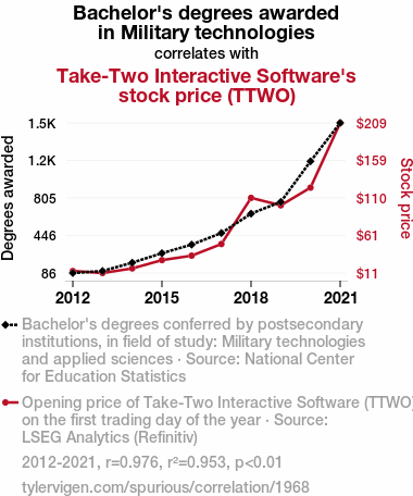 bachelor's degrees, military technologies, applied sciences, stock market, Take-Two Interactive Software, correlation coefficient, statistical analysis, National Center for Education Statistics, LSEG Analytics, Refinitiv, education and financial markets, unconventional correlations