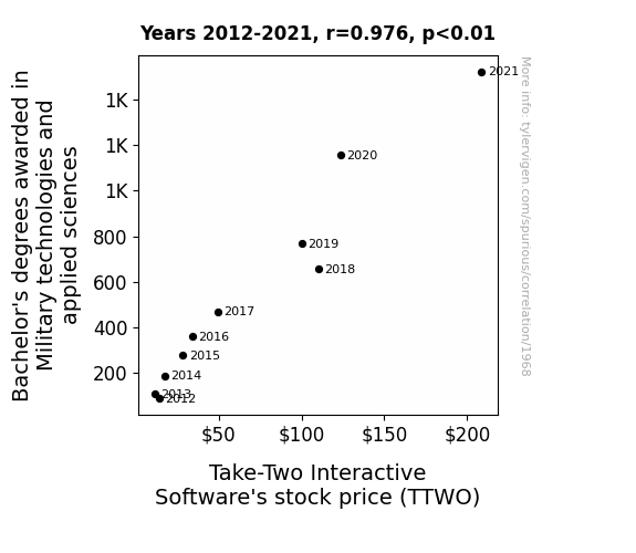 Our team meticulously gathered data on the number of Bachelor's degrees awarded in the field of Military Technologies and Applied Sciences from the National Center for Education Statistics, spanning the years 2012 to 2021. Simultaneously, stock price information for Take-Two Interactive Software (TTWO) was obtained from LSEG Analytics (Refinitiv), capturing the same temporal span. The convergence of these disparate data streams underpinned our quest for unexpected correlations, reminding us that in the world of statistical inquiry, the unlikeliest of allies can reveal surprising alliances.