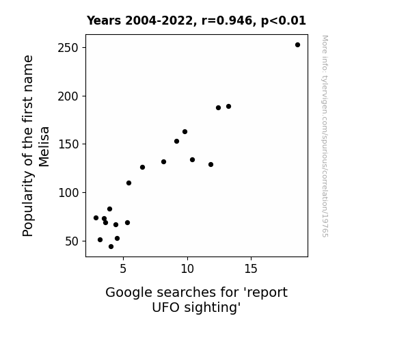 This means 89.4% of the change in the one variable (i.e., Google searches for 'report UFO sighting') is predictable based on the change in the other (i.e., Popularity of the first name Melisa) over the 19 years from 2004 through 2022.