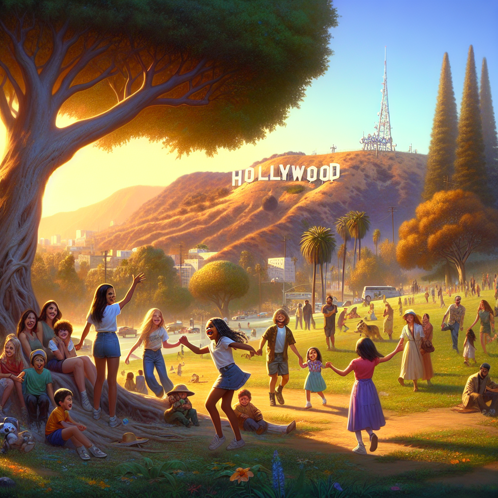 User prompt: Please respond with an image generation prompt that would be likely to create an interesting visual using DALLE-3, using the following style: [ Cyber folk ] and depicting this scene: In a beautiful Los Angeles park, a group of people gathers under the shade of a large tree. In the background, the famous Hollywood sign is visible through the clear blue sky. As the sun sets, the air is crisp and refreshing. Among the group, there are several children happily playing, and one of them is called Reyna. She is surrounded by friends and laughs joyfully, enjoying the pleasant and good air quality in the city. Keep the visual depiction simple. Do not include any words or speech bubbles.