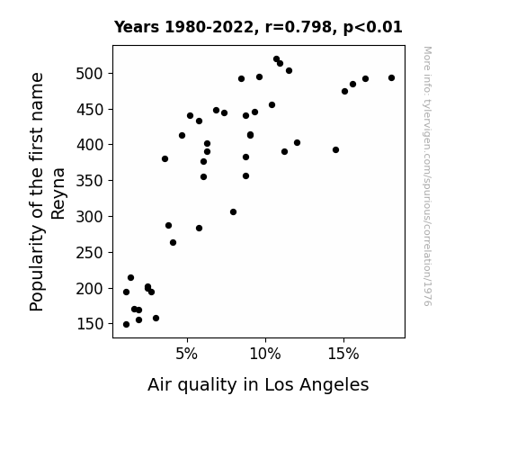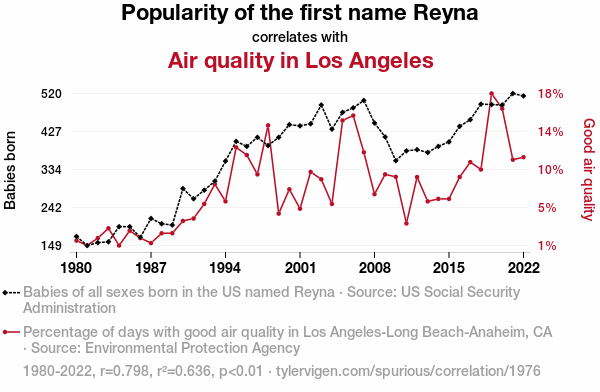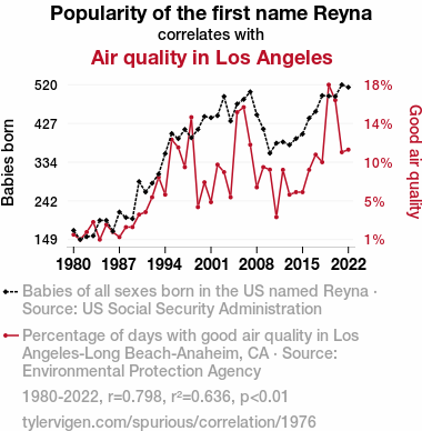 - The spurious research paper: Every Breath You Take: The Surprisingly Breathable Connection between the Popularity of the First Name Reyna and Air Quality in Los Angeles