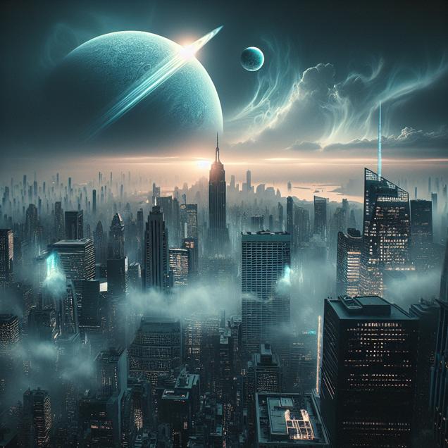 User prompt: Please respond with an image generation prompt that would be likely to create an interesting visual using DALLE-3, using the following style: [ Sci-fi fantasy ] and depicting this scene: In New York City, with Neptune positioned in the sky, the sun appears as a tiny speck in the far distance. The air is thick and hazy, with a visible smog hanging over the city, indicating unhealthy air quality. Keep the visual depiction simple. Do not include any words or speech bubbles.
