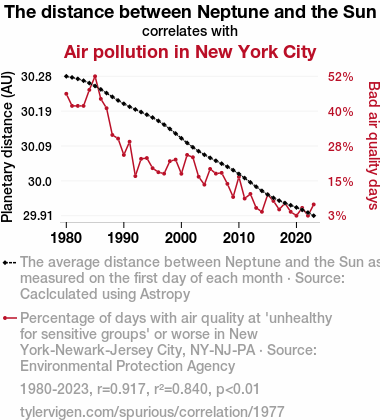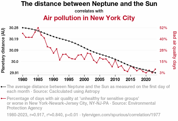 This means 84% of the change in the one variable (i.e., Air pollution in New York City) is predictable based on the change in the other (i.e., The distance between Neptune and the Sun) over the 44 years from 1980 through 2023.