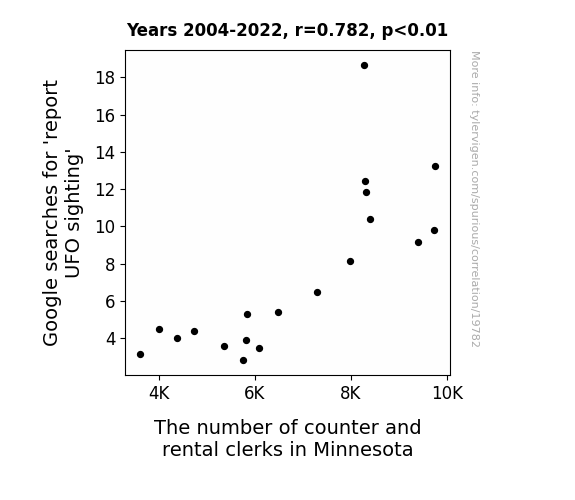 This means 61.2% of the change in the one variable (i.e., The number of counter and rental clerks in Minnesota) is predictable based on the change in the other (i.e., Google searches for 'report UFO sighting') over the 19 years from 2004 through 2022.