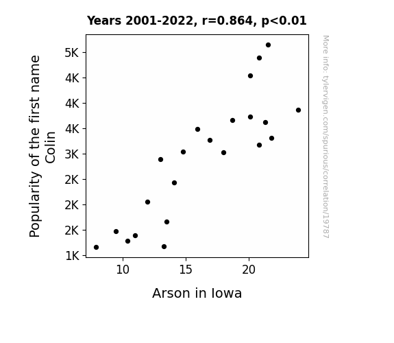 This means 74.6% of the change in the one variable (i.e., Arson in Iowa) is predictable based on the change in the other (i.e., Popularity of the first name Colin) over the 22 years from 2001 through 2022.