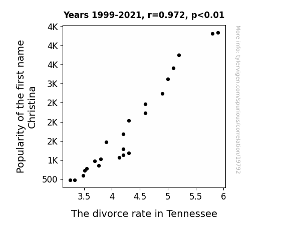 This means 94.5% of the change in the one variable (i.e., The divorce rate in Tennessee) is predictable based on the change in the other (i.e., Popularity of the first name Christina) over the 23 years from 1999 through 2021.