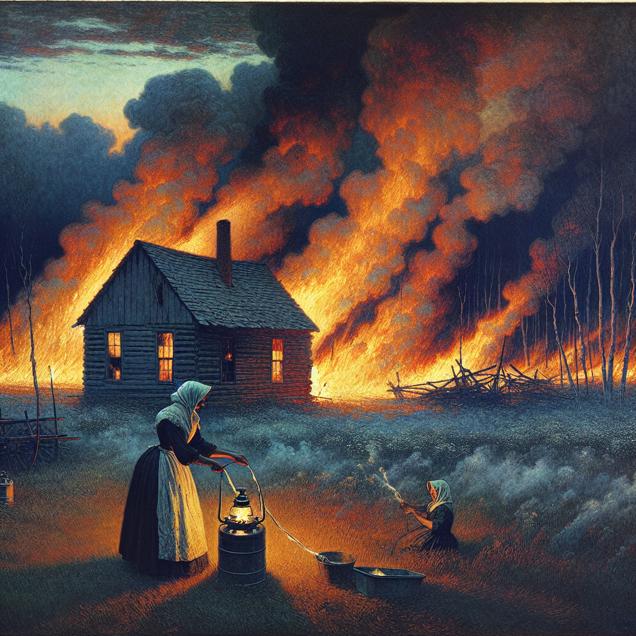 Prompt: [An impressionist painting] In a field in Maine, a small wooden cabin is engulfed in flames, with thick pillars of smoke rising into the air. Neighboring trees and grass are also catching fire, creating a chaotic and intense scene. Meanwhile, in a market in Turkey, a woman is pouring kerosene from a metal can into a lantern to light up the evening, with the warm glow of the flame contrasting against the darkness of the surroundings. The depiction should include only scenes, people, and objects, it should not include text or speech bubbles.