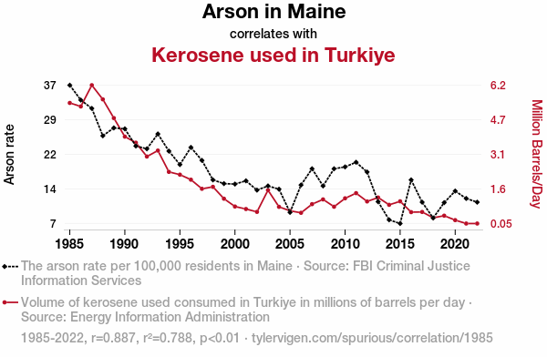 - The spurious research paper: Playing with Fire: A Flammable Connection Between Arson in Maine and Kerosene consumption in Turkiye