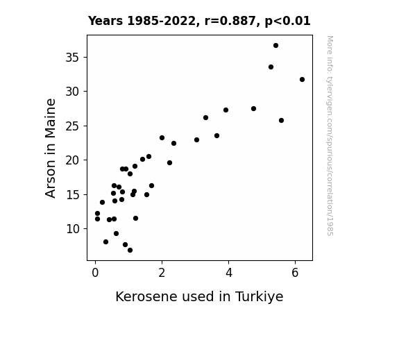 This means 78.8% of the change in the one variable (i.e., Kerosene used in Turkiye) is predictable based on the change in the other (i.e., Arson in Maine) over the 38 years from 1985 through 2022.