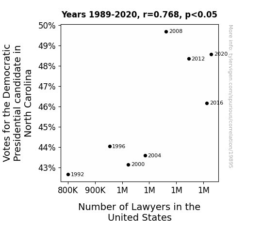 This means 59% of the change in the one variable (i.e., Number of Lawyers in the United States) is predictable based on the change in the other (i.e., Votes for the Democratic Presidential candidate in North Carolina) over the 8 years from 1989 through 2020.