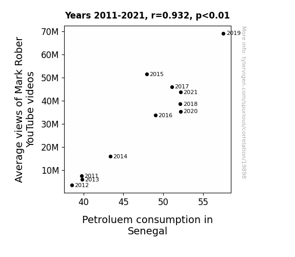 This means 86.9% of the change in the one variable (i.e., Petroluem consumption in Senegal) is predictable based on the change in the other (i.e., Average views of Mark Rober YouTube videos) over the 11 years from 2011 through 2021.