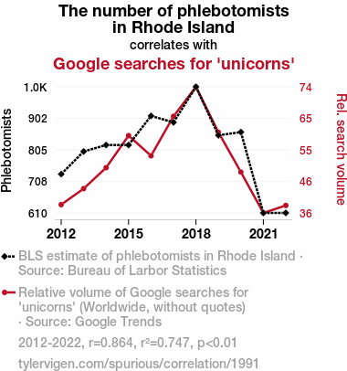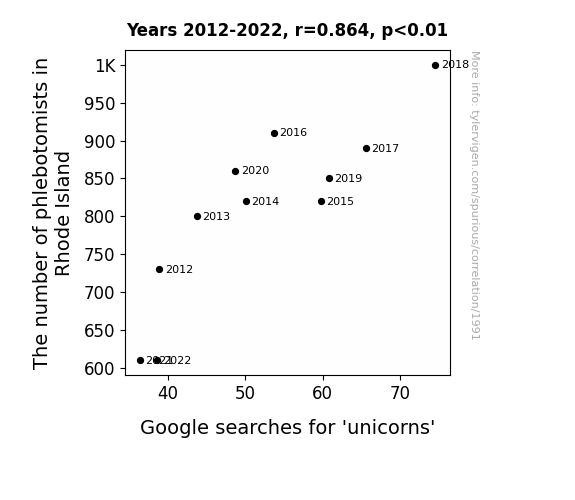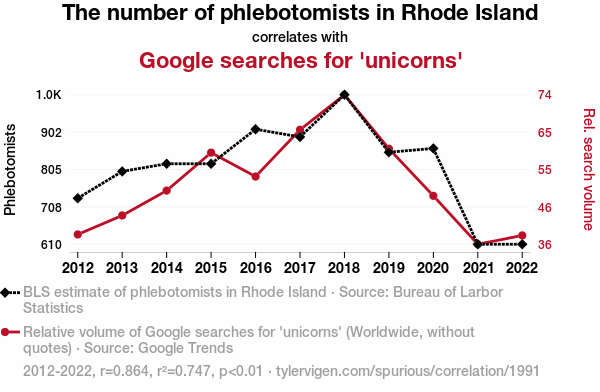 This means 74.7% of the change in the one variable (i.e., Google searches for 'unicorns') is predictable based on the change in the other (i.e., The number of phlebotomists in Rhode Island) over the 11 years from 2012 through 2022.