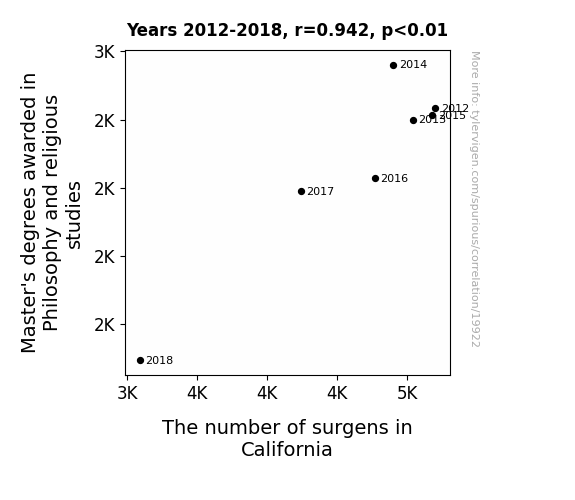 This means 88.7% of the change in the one variable (i.e., The number of surgens in California) is predictable based on the change in the other (i.e., Master's degrees awarded in Philosophy and religious studies) over the 7 years from 2012 through 2018.