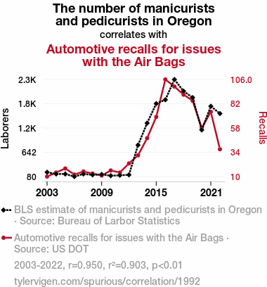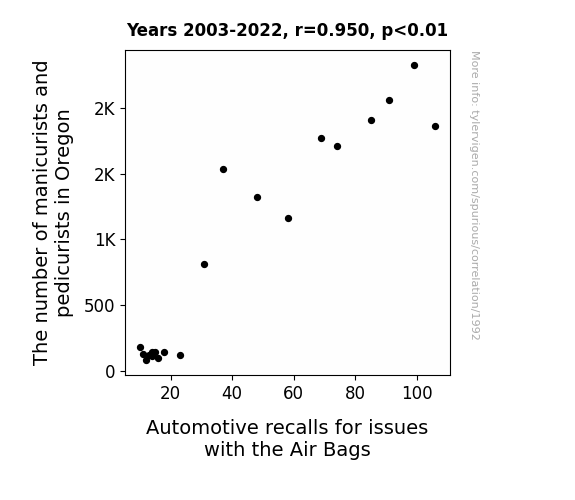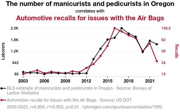 This means 90.3% of the change in the one variable (i.e., Automotive recalls for issues with the Air Bags) is predictable based on the change in the other (i.e., The number of manicurists and pedicurists in Oregon) over the 20 years from 2003 through 2022.