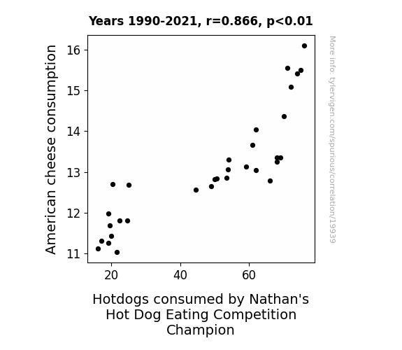 This means 75% of the change in the one variable (i.e., Hotdogs consumed by Nathan's Hot Dog Eating Competition Champion) is predictable based on the change in the other (i.e., American cheese consumption) over the 32 years from 1990 through 2021.