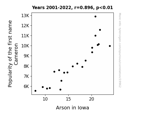 This means 80.2% of the change in the one variable (i.e., Arson in Iowa) is predictable based on the change in the other (i.e., Popularity of the first name Cameron) over the 22 years from 2001 through 2022.
