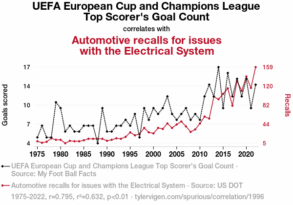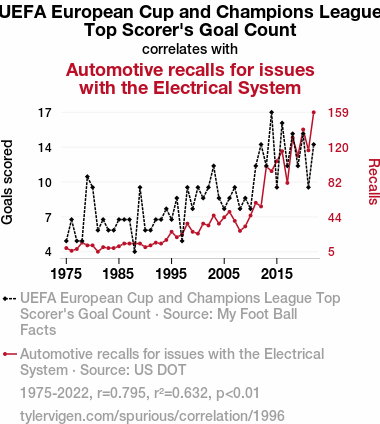 - The spurious research paper: Scoring Goals and Short-Circuiting Systems: A Correlation Between UEFA European Cup and Champions League Top Scorer's Goal Count and Automotive Electrical System Recalls