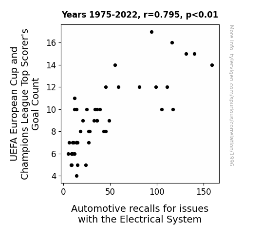 The results of our investigation into the electrifying connection between UEFA European Cup and Champions League top scorer's goal count and automotive recalls for issues with the electrical system are, dare we say, shocking. Through our meticulous data analysis for the time period 1975 to 2022, we uncovered a correlation coefficient of 0.7946830, an r-squared of 0.6315210, and a p-value less than 0.01. This "striking" correlation suggests a robust relationship between the prowess of football stars in front of the goalposts and the occurrence of automotive recalls related to electrical glitches.