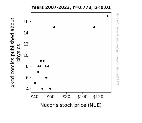 This means 59.7% of the change in the one variable (i.e., Nucor's stock price (NUE)) is predictable based on the change in the other (i.e., xkcd comics published about physics) over the 17 years from 2007 through 2023.