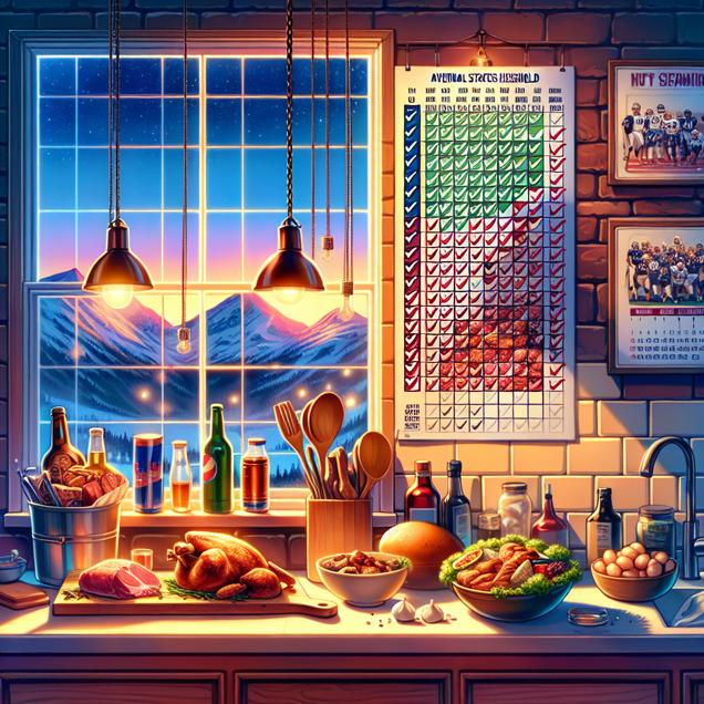 User prompt: Please respond with an image generation prompt that would be likely to create an interesting visual using DALLE-3, using the following style: [ A Discovery magazine cover image ] and depicting this scene: In a cozy kitchen, a Buffalo Bills calendar hangs on the wall, marking the team's season wins with small checkmarks. On the countertop, a spread of succulent meats, poultry, fish, and a carton of fresh eggs are displayed, representing annual US household spending on these items. Keep the visual depiction simple. Do not include any words or speech bubbles.