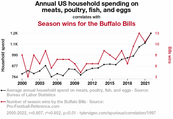 This means 65.2% of the change in the one variable (i.e., Season wins for the Buffalo Bills) is predictable based on the change in the other (i.e., Annual US household spending on meats, poultry, fish, and eggs) over the 23 years from 2000 through 2022.