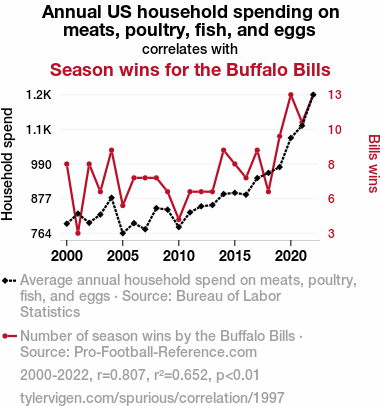 A linear line chart with years as the X-axis and two variables on the Y-axis. The first variable is Annual US household spending on meats, poultry, fish, and eggs and the second variable is Season wins for the Buffalo Bills.  The chart goes from 2000 to 2022, and the two variables track closely in value over that time. Small Image