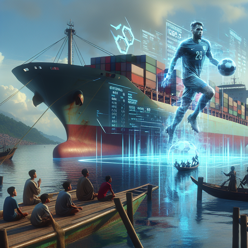 User prompt: Please respond with an image generation prompt that would be likely to create an interesting visual using DALLE-3, using the following style: [ High-tech ] and depicting this scene: Amidst the serene Indonesian waters, Gareth Bale dribbles past a group of pirates on a football pitch built on a large cargo ship. The number of pirate attacks in Indonesia and the total number of Gareth Bale's club football matches are boldly painted on the side of the ship, symbolizing the intersection of sports and real-world challenges. Keep the visual depiction simple. Do not include any words or speech bubbles.