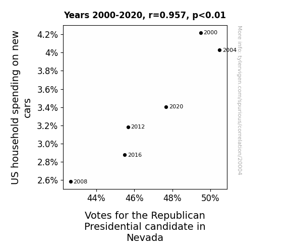 This means 91.6% of the change in the one variable (i.e., Votes for the Republican Presidential candidate in Nevada) is predictable based on the change in the other (i.e., US household spending on new cars) over the 6 years from 2000 through 2020.