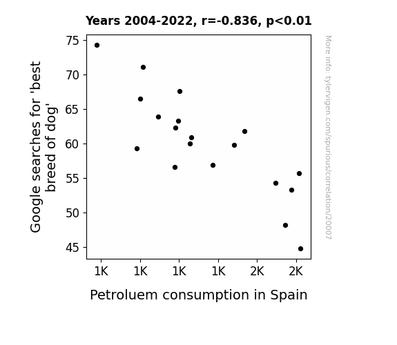 This means 69.9% of the change in the one variable (i.e., Petroluem consumption in Spain) is predictable based on the change in the other (i.e., Google searches for 'best breed of dog') over the 19 years from 2004 through 2022.