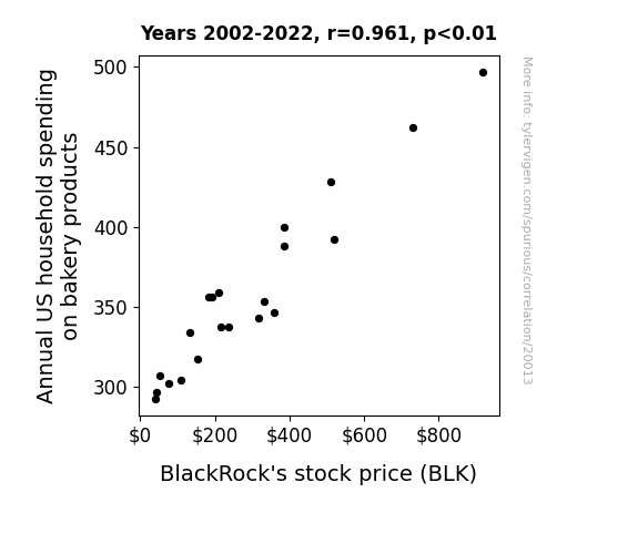 This means 92.3% of the change in the one variable (i.e., BlackRock's stock price (BLK)) is predictable based on the change in the other (i.e., Annual US household spending on bakery products) over the 21 years from 2002 through 2022.