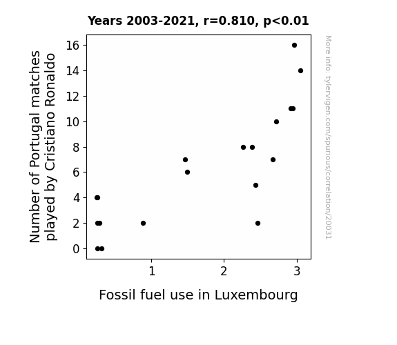 This means 65.7% of the change in the one variable (i.e., Fossil fuel use in Luxembourg) is predictable based on the change in the other (i.e., Number of Portugal matches played by Cristiano Ronaldo) over the 19 years from 2003 through 2021.