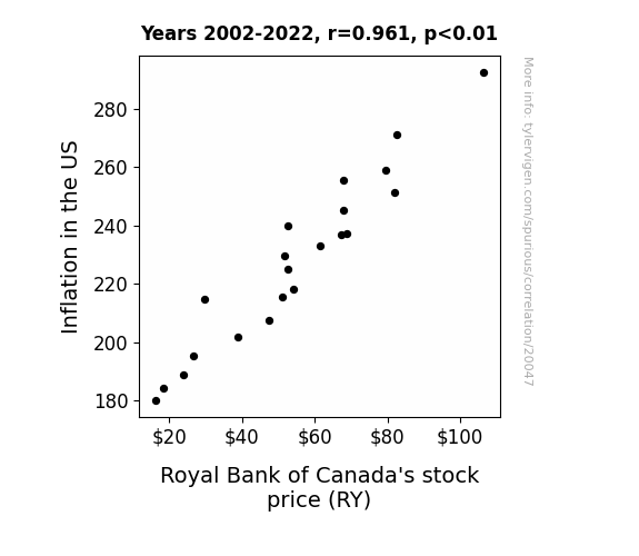 This means 92.4% of the change in the one variable (i.e., Royal Bank of Canada's stock price (RY)) is predictable based on the change in the other (i.e., Inflation in the US) over the 21 years from 2002 through 2022.