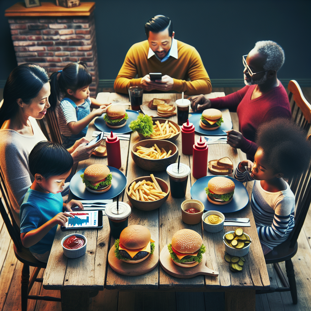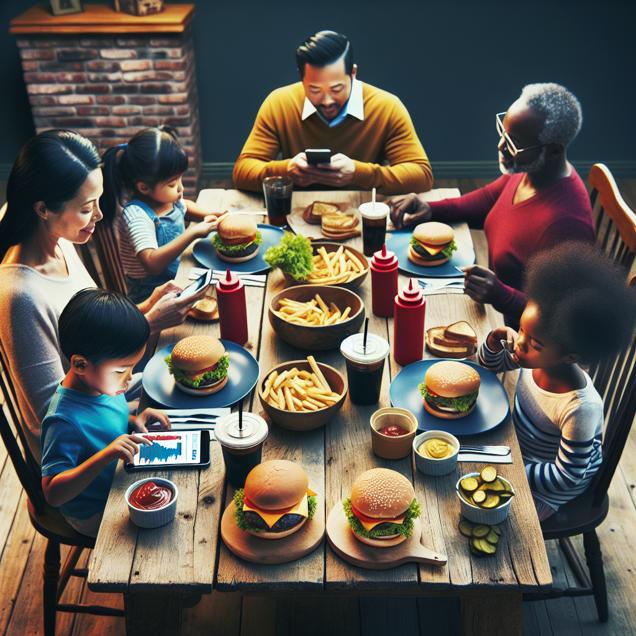 Prompt: Generate an image of a family sitting at a wooden dining table, smiling and chatting while enjoying classic cheeseburgers with American cheese slices. The table is set with ketchup, mustard, pickles, and fries. The father is holding a smartphone, checking the Mastercard stock price, while the mother helps the kids with their meals. The scene captures a warm, family gathering with a hint of modernity through the use of technology. The emphasis should be on the joyful family moment with subtle indications of the smartphone activity. The depiction should include only scenes, people, and objects, it should not include text or speech bubbles.