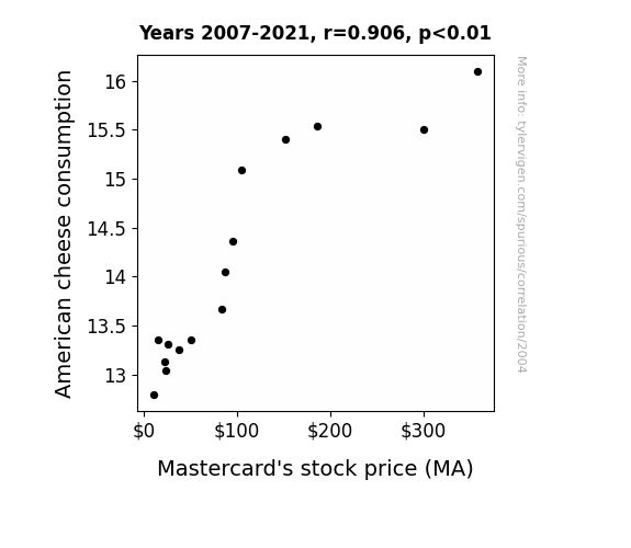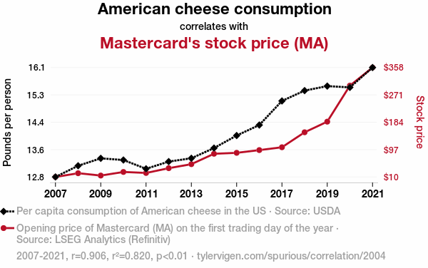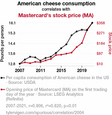 - The spurious research paper: Cheddar, Swiping, and Stock Prices: The Emmental Connection Between American Cheese Consumption and Mastercard's Stock (MA)